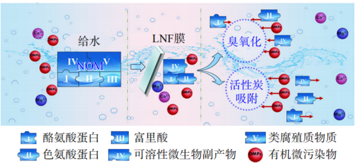 膜分离技术在新污染物分离和去除中展现巨大的应用潜力,但膜材料存在选择权衡效应和膜污堵问题。将二维(2D)层状材料引入聚合物膜结构制备的二维材料改性聚合物膜(2DNMPMs),能提升膜的渗透通量、抗污染能力和机械能力。新膜工艺的构建旨在实现各工艺优势的最大化。例如,侯立安团队开发了一种疏松纳滤膜后接臭氧高级氧化或者活性炭的组合工艺,该工艺能够高效去除饮用水中的新污染物,同时保留钙镁等有益矿物离子,为生产高品质饮用水提供了新的工艺思路(图5)。