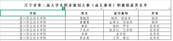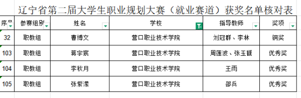近期,辽宁省第二届大学生职业规划大赛已圆满落幕。在全省范围内,共计103所高校的62.89万名学生踊跃参与。经过多轮选拔,在职业教育组别中,75名选手成功晋级成长赛道决赛,55名选手晋级就业赛道决赛。营口职业技术学院的学子凭借其扎实的专业知识和过硬的职业素养,在全省62万名参赛者中脱颖而出,再创佳绩,共荣获10项奖项,其中包括铜奖3项和优秀奖7项,获奖数量与质量均创学院历史新高。