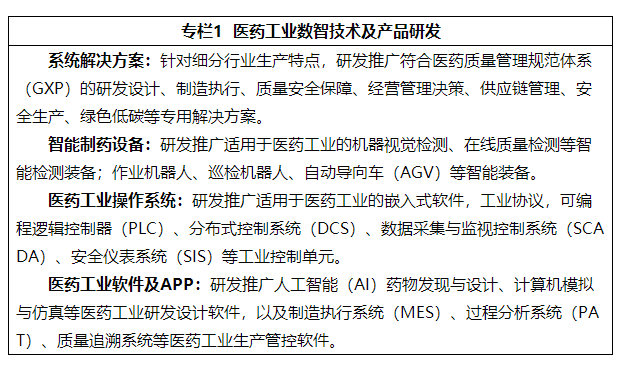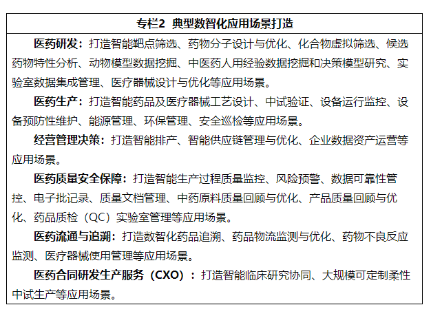 1.推广典型数智技术应用卓越场景。围绕医药研发、医药生产、经营管理决策、医药质量安全保障、医药流通与追溯、医药合同研发生产服务(CXO)等方面,系统梳理数智化转型场景清单,以及数据要素、知识模型、工具软件、人才技能等要素清单,支持医药企业和信息技术服务企业联合打造数智化应用场景,系统化推进医药企业数智化转型。