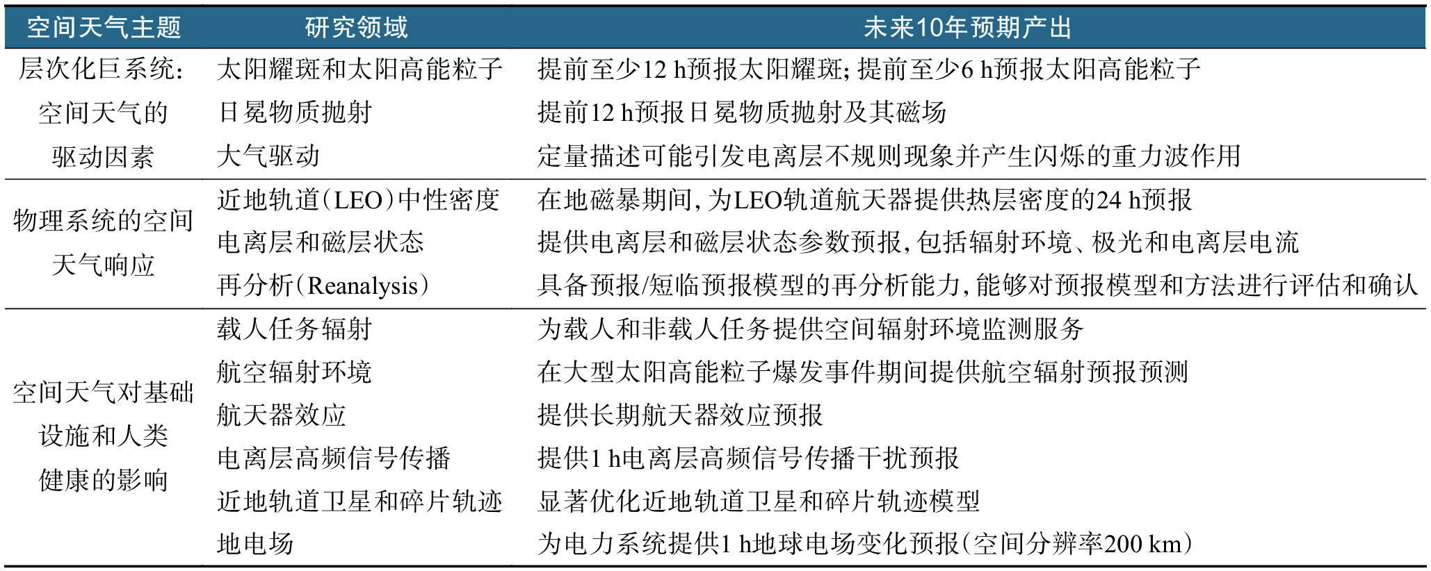 空间天气主题:包含“层次化巨系统:空间天气的驱动因素”、“物理系统的空间天气响应”、“空间天气对基础设施和人类健康的影响”3个主题,确定了重点研究领域(表3)和未来预期产出(表4)。