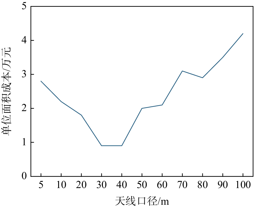 其次,成本效益是另一个主要考虑因素。当口径超过40 m时,单位面积成本呈显著增长。因此,30 m或40 m望远镜是与FAST组阵的最经济选择,其中40 m口径望远镜的单位面积成本相对较低(图3)。