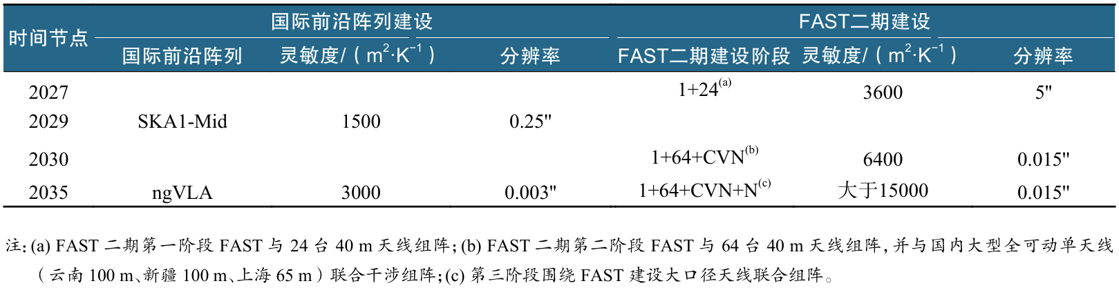 到2030年,项目计划再完成40台40 m口径望远镜的建设,扩展至FAST周边30 km半径。随着天线数量的增加,阵列的UV覆盖和灵敏度将进一步提升,灵敏度将达到6000m²/K。届时,将完成FAST二期阵列的升级,并与国内其他大口径射电望远镜进一步融合,形成全国中低频甚长基线干涉测量网(Verylong-baseline interferometry,VLBI网)。该网络的角分辨率将达到15 mas,成为全球领先的中低频射电观测网络。FAST核心阵各建设阶段时间节点、性能与国际前沿干涉阵列对比见表2。
