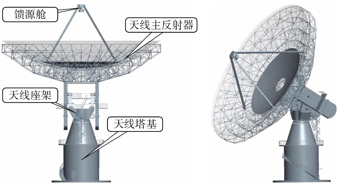 40 m天线主要由天馈分系统、结构分系统、伺服分系统3部分组成(图9)。天线工作时,射电信号由主反射面反射后汇集到焦点,能量经位于焦点的馈源进入低噪声放大器(lownoise amplifier,LNA)并放大送至后端设备。天线运动性能指标见表3。40 m望远镜全口径工作频率不低于5 GHz,反射面中心区域22 m为实心面板,这部分工作频率不低于20 GHz(图9),实现一些高频谱线观测的科学需求。