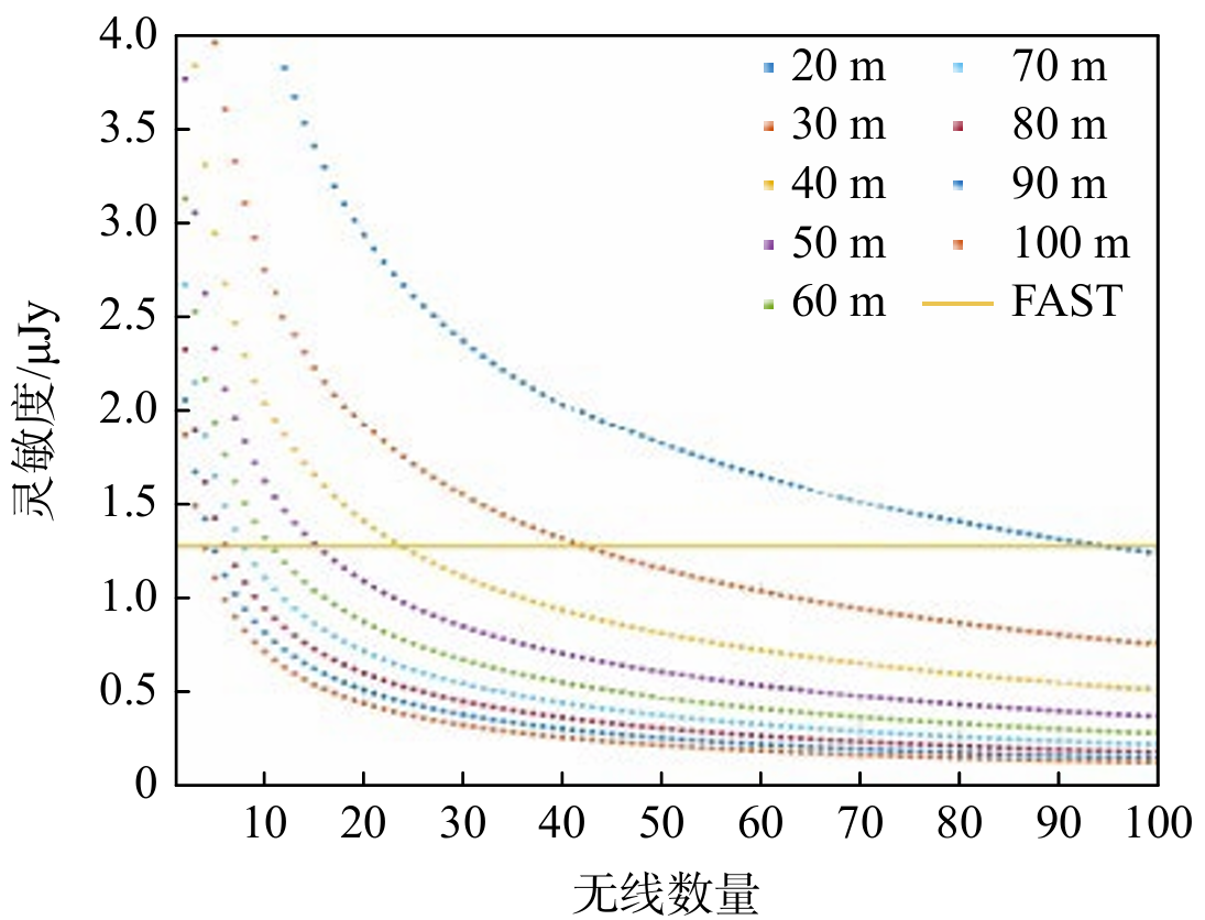 FAST工程二期项目将采用40 m口径望远镜组阵,主要基于2个关键因素。首先,40 m口径望远镜与FAST的19波束馈源具有理想的视场匹配,适合组阵配置。为维持FAST的灵敏度水平(2600m²/K),计算结果显示,不同口径望远镜与FAST组阵所需的天线数量各不相同。如图2所示,灵敏度曲线显示,为保持FAST的超高灵敏度优势,100 m口径望远镜需要4台,60 m口径需要15台,40 m口径需要至少24台,30 m口径则需至少42台。这意味着该综合阵列将拥有与FAST相当的探测致密射电源的能力,能够进行精确定位,确保不会错失重要的科学发现。