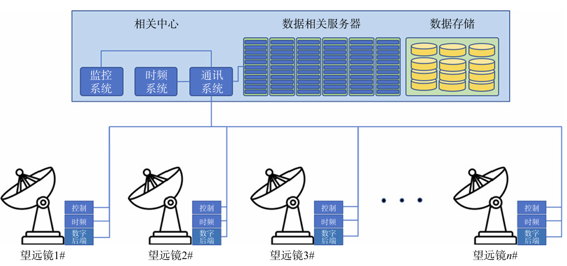 将在望远镜阵列各站建设配套屏蔽机房,机房内安装望远镜本地控制单元、时频单元、接收机数字终端等。阵列单元安装工作频率、噪声温度等性能完全一致的接收机,各站接收机观测信号通过光纤首先进入本地数字后端,在本地完成数字化,数字信号由光缆传输到望远镜阵列相关中心。数字信号相比模拟信号,在传输过程中具有更强的抗干扰能力,并且数字信号将在天线本地标记时间戳后再传输,避免长距离光纤传输带来的相位误差,各站观测数据在相关处理中心完成相关处理后进行存储,如图10所示。相关处理服务器是望远镜阵列的核心数据处理设备,阵列中的每台天线都会产生基带数据流,为了实时处理这些高速数据流,需要搭建专用的硬件相关处理机。