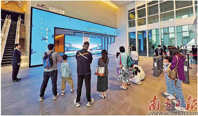 白鹅潭大湾区艺术中心矗立珠水之滨,犹如一艘“文化巨轮”。走进广东文学馆序厅,沉浸式剧场为观众敞开“文学之门”:张九龄、苏轼、陈白沙、康有为等文化名人“纷至沓来”,将广东文学的厚重“家底”化为生动的光影画卷。