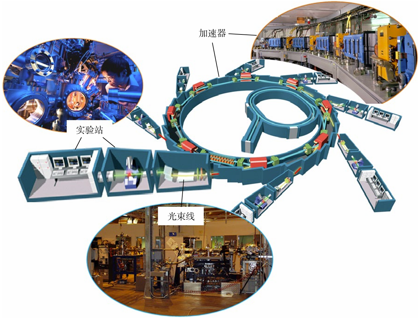在基础研究领域,粒子加速器的一个重要的发展方向是同步辐射光源。根据电磁场理论,当电子以接近光速作弯转运动时,会沿其轨道切线方向发射电磁波,这就像雨天我们转动雨伞时所看到的情景一样。因为这种电磁波是在电子同步加速器上被首次观测到的,因此被命名为同步辐射。用于产生和利用同步辐射的科学装置便是同步辐射光源(图1)。同步辐射光源所产生的同步辐射光具有宽波段、高准直、高偏振、高亮度、高稳定性、可供多用户同时使用等优异性能。发展至今,全世界有超过50台同步辐射光源同时运行,已然成为物理化学、能源环境、生物医学等诸多科学领域进行前沿研究的重要工具。