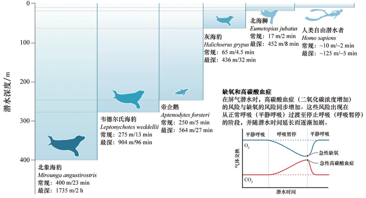 潜水动物在潜水时必须屏住呼吸,因此,随着潜水时间延长,缺氧(氧气不足)的状态会随之加剧。潜水动物依靠增加血氧含量、减少耗氧量等生理适应机制来应对这种状态。图中按一定比例列出了各物种的常规潜水深度以及最深潜水记录,以示对比。