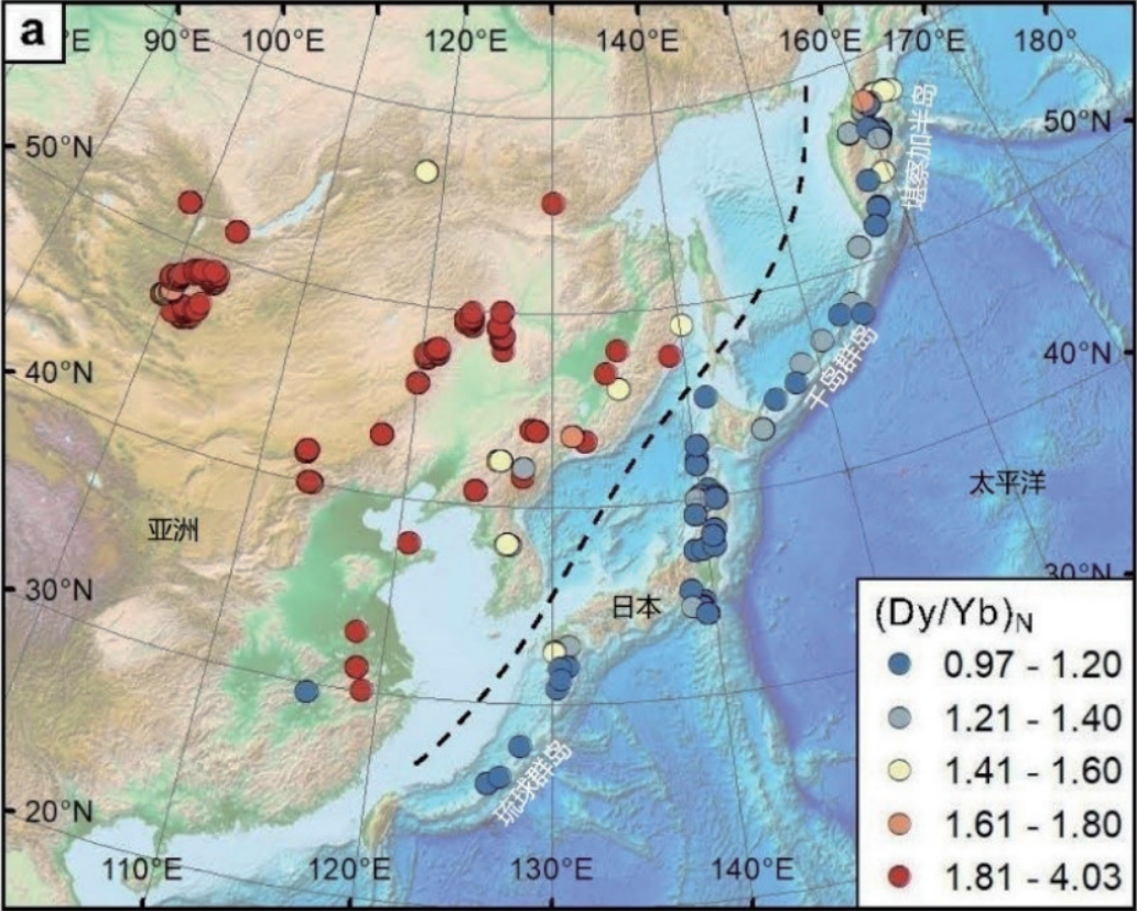 距今1000万年以来弧-陆构造体系中东亚地区玄武岩的Dy/Yb(稀土元素镝和镱的比值,常作为构造背景的判别指标)空间分布。