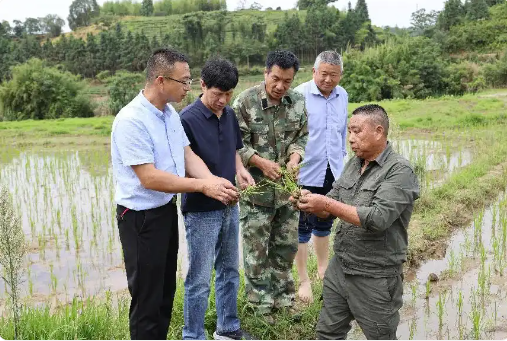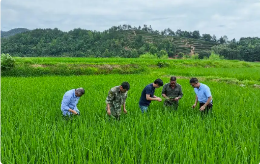 6月5日,武夷山市兴田镇科技人员到乡土科技特派员张建文(右二)的再生稻种植基地指导抽穗期田间管理。