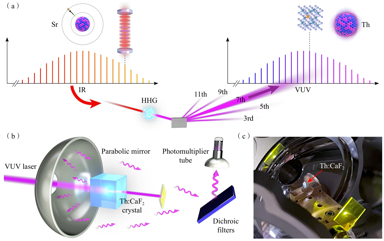 同时,来自美国的课题组利用紫外激光直接激发固态CaF2宿主材料中的229Th跃迁,并测定了其绝对跃迁频率。通过将频率梳的基础频率锁定至联合天体物理实验室(JILA)的87Sr原子钟,在核能级与电子能级之间建立了频率链接(图32),从而首次测量了229Th核钟跃迁与87Sr原子钟的频率比。