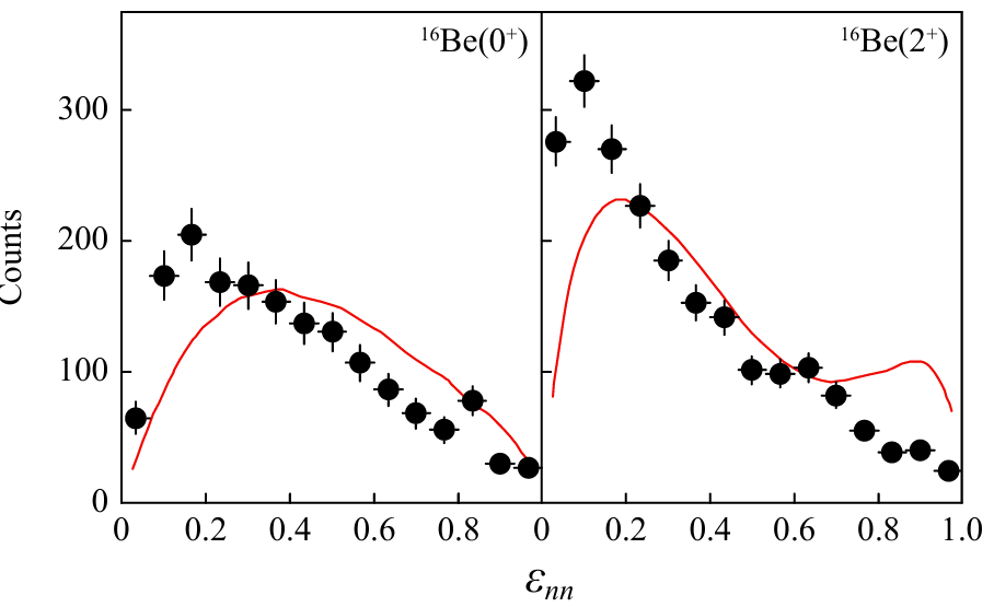 同时,在轻核区,最富中子的铍同位素16Be的奇特结构和衰变模式也通过17B的质子敲出反应进行了研究。首次观察到2个阈值之上相对狭窄的共振态,并且2个态均观察到直接的双中子发射衰变。通过与理论计算的核子关联对比表明(图9),该衰变过程是一个真正的三体过程。对人们了解极端条件下的核子关联与开放量子体系的衰变性质有重要意义。