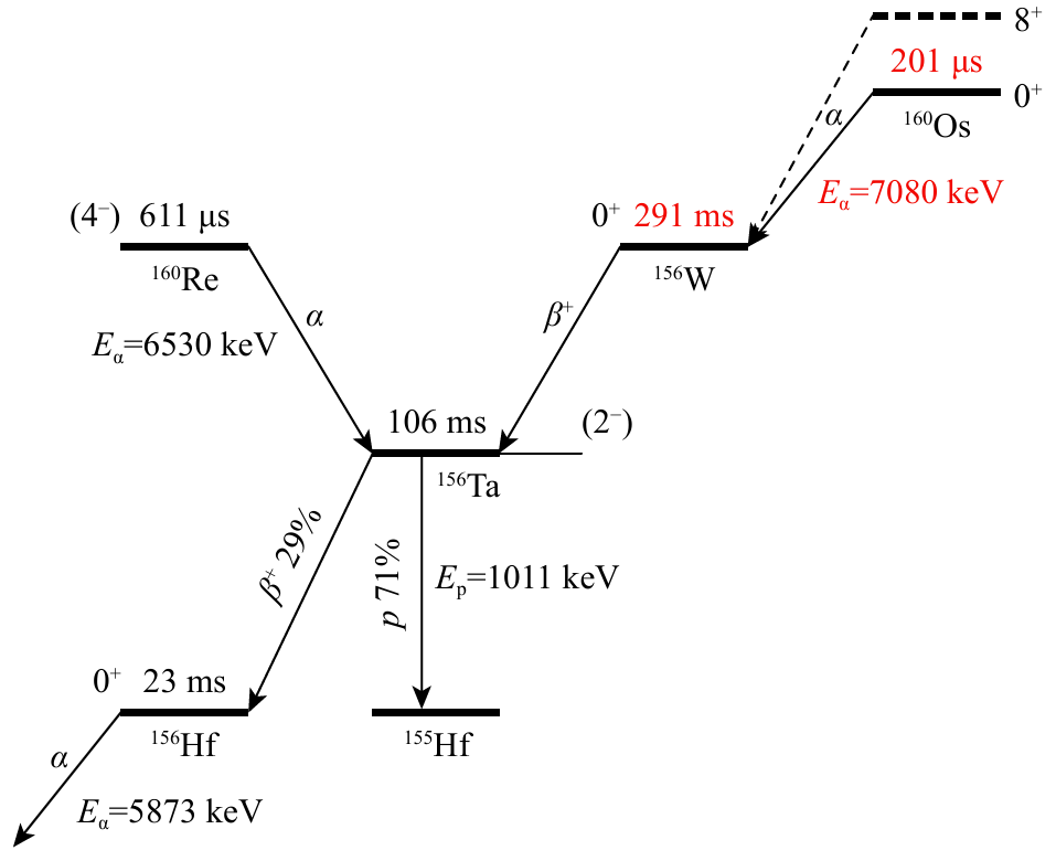N=82是一个非常典型的中子幻数,中子数为82时,原子核的状态通常很稳定。2024年,中国科学院近代物理研究所的研究人员利用熔合蒸发反应首次鉴别了160Os和156W核,它们代表了迄今为止最富含质子的N=84和N=82核素。160Os的α衰变测量被确定为来自基态(图1),子核156W是β+发射体。根据新测量的数据,能够发现从N=84同中子素到Os(Z=76)的α约化衰变宽度随着质子数增加而减小。这被解释为质子滴线区N=82壳层加强的证据。