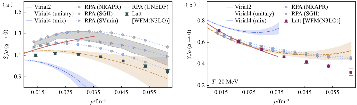 从核心坍缩超新星爆发到中子星合并,量子多体计算在理解极端天体环境中物质的行为方面起着至关重要的作用。然而,由于现实核力的复杂性,高精度的第一性原理计算面临诸多挑战,例如蒙特卡洛计算中广泛存在的符号震荡问题。华南师范大学科研团队与合作者,利用最新发展的波函数匹配(wavefunction matching)方法,通过微扰论成功绕过了符号震荡问题,创新性地提出了秩一算符(rank–one operator)方法,有效应对了多体算符和高阶修正的计算瓶颈。结果显示,在低密度条件下,格点计算结果与传统的维里展开方法高度一致;而在高密度条件下,格点计算展现出显著优势,提供了更可靠的理论预言,弥补了其他近似方法的不足(图33)。这些格点计算结果为随机相位近似(RPA)及其他理论模型的标定提供了高精度数据,也为超新星爆发的三维模拟提供了关键的输入量。