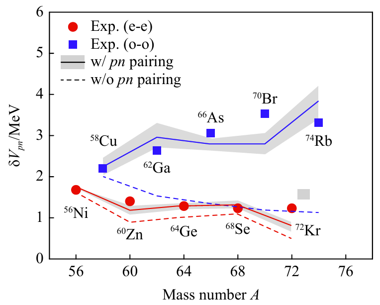 同时,对质量数不同的邻近原子核的质量研究也可以提取出有关核力等信息。国内的研究人员建立了一种基于相对论密度泛函理论的类壳模型方法,同时从微观和自洽的角度处理中子–中子、质子–中子和质子–质子的配对关联。无需任何特殊参数,计算结果很好地重现了观测的从Ni到Rb的偶–偶和奇–奇N=Z核中双结合能差δVpn随质量数演化趋势相反的异常现象(图13),发现这种异常分叉的机制是由于奇–奇N=Z核中的质子–中子配对关联比偶偶核中的增强。