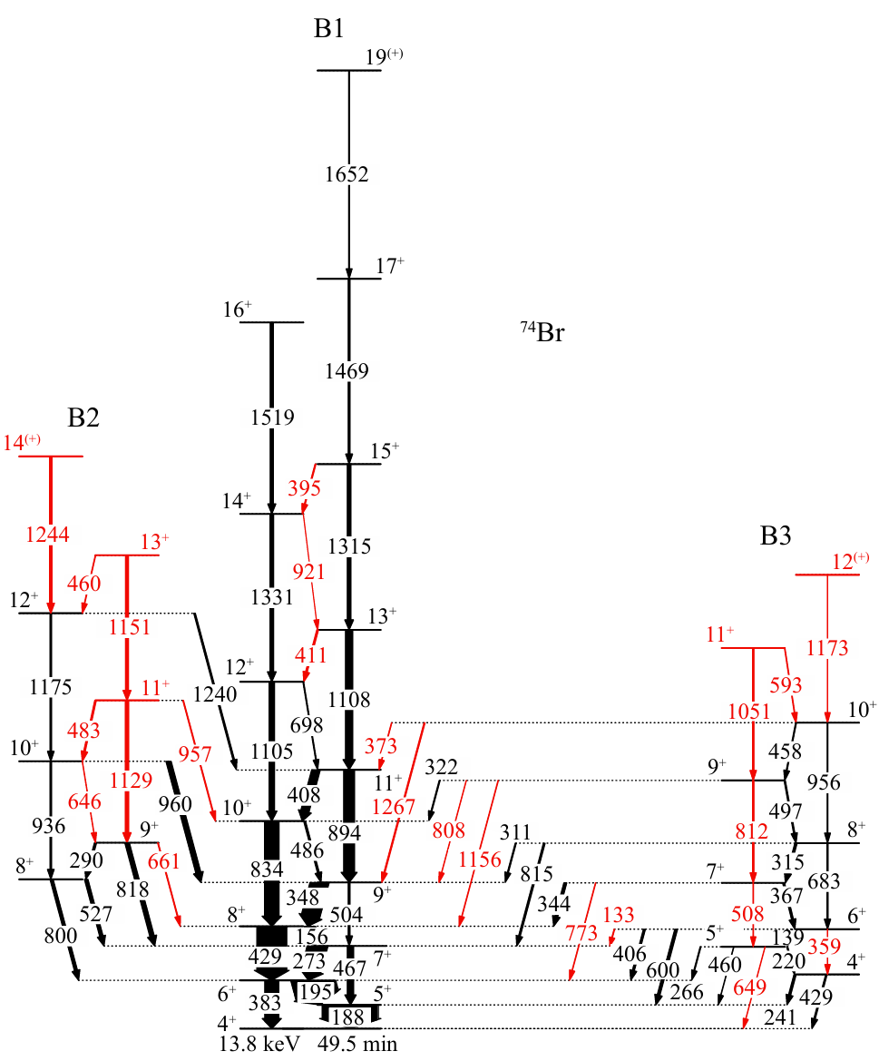 山东大学、北京大学等的研究团队在7435Br39中发现了3个具有πg9/2⊗vg9/2组态的∆I=1带。通过对角分布、线性极化和寿命的测量,确定了跃迁的多极性、类型、混合比和绝对跃迁概率。通过将实验测量结果和手征带、摇摆带的实验判据以及量子化的粒子转子模型计算结果进行对比,第二条和第三条带被分别指定为晕带的手征伙伴带和一声子摇摆激发带(图6)。这是在核系统中第一次观测到2种三轴形变的直接实验证据在同一组态下的共存,表明原子核的手征对称几何可以鲁棒摇摆激发。
