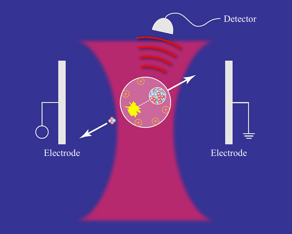 另一方面,有关原子核衰变的探测技术也在不断发展。耶鲁大学的研究团队利用动量守恒原理,研究了放射性原子发射α粒子的衰变过程。实验中,他们将二氧化硅微球悬浮在高真空中,微球表面植入了少量放射性铅–212原子。研究人员通过电学和光学2种方法同时监测微球(图10)。电学方法检测微球对振荡电场的响应,从而确定它携带的电荷变化,任何电荷变化表明核衰变导致了带电粒子的射出;而光学方法则通过微球散射的光追踪其运动,精确重构微球的反冲数据实验结果显示,α衰变能够通过微球上的反冲信号检测到,微球的质量是衰变产物的1012倍。该技术能够提高对中微子或暗物质等非相互作用粒子衰变产物的探测灵敏度,解决了传统衰变探测器的局限,尤其适用于检测那些难以与探测介质相互作用的粒子。
