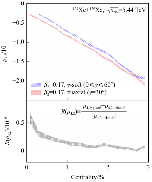 同时,形状相变在中低能原子核物理中也是也一个重要的概念,主要用来解释某些同位素或同中子素链在其低能结构(如核子关联与集体运动模式等)及性质演化过程中的变化。这一现象与核的对称性密切相关,深入了解其规律将加深我们对原子核基本性质的认知。利用iEBE–VISHNU耦合模型,北京大学团队系统地计算了129Xe+129Xe碰撞中的椭圆流与横动量关联等观测量,并预测ρ4,2等6粒子关联对二级形状相变的敏感性(图26)。