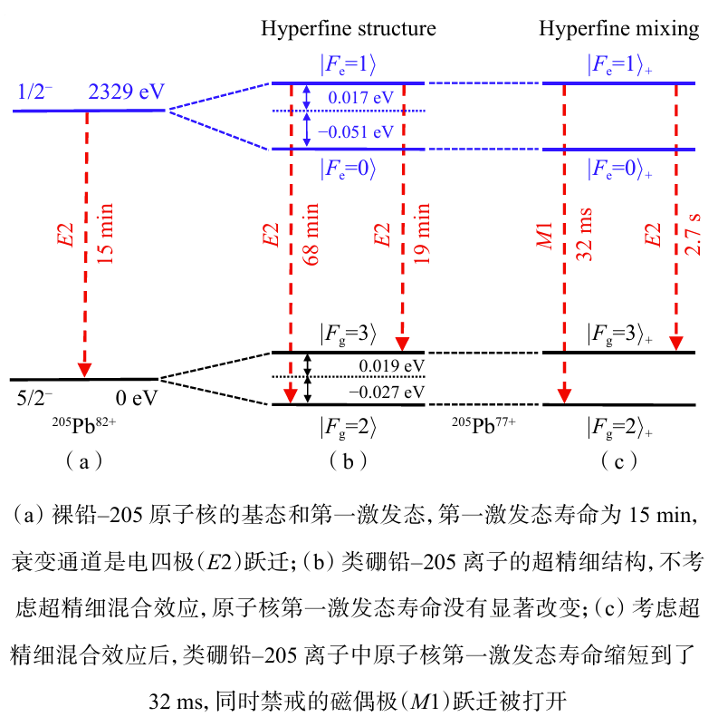 通常情况下,原子核的性质不会受到核外电子的影响,但内层电子在原子核处可产生强大的电磁场,诱发不同核态之间的混合,从而改变原子核的性质。这一效应被称为原子核超精细混合效应(nuclear hyperfine mixing)。当2个电子态之间的能量差与原子核能级差匹配,同时角动量也满足匹配条件时,便可能出现显著的超精细混合效应。基于这一新机制,研究预测在类硼铅–205离子(铅–205的77价离子)中,由于2p1/2和2p3/2电子态之间的能量差(2356 eV)与铅–205原子核第一激发态的能量(2329 eV)接近,将引发显著的超精细混合效应(图29)。