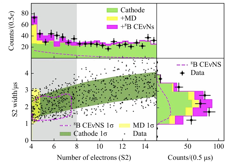 图28 PandaX–4T采集的数据在能量和信号宽度的两维分布,粉红色为拟合的太阳硼–8中微子超出信号