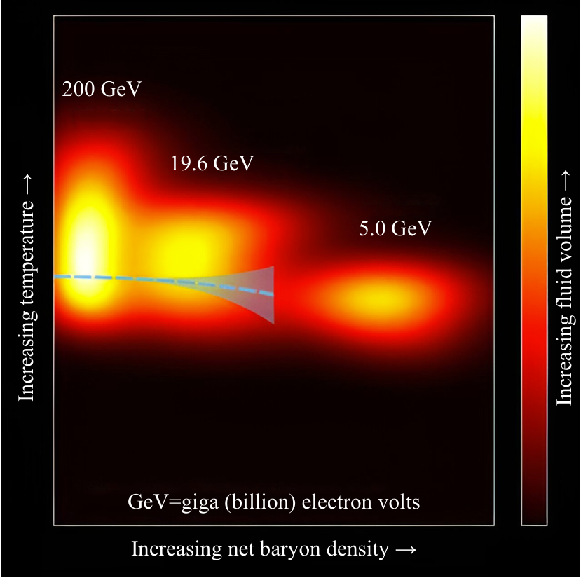 夸克–胶子等离子体这种极端条件下的物质状态可以近似地看成流体,一般这种流体的粘滞系数非常低。最近理论物理学家系统地研究了这种粘滞系数在广泛的碰撞能量范围内的变化,发现随着净重子密度的增加,流体的粘滞系数也会增加(图18)。这种基于数据的分析研究了粘度如何依赖于净重子密度,结果与理论计算相比较,为核物质相图研究提供了重要基准。