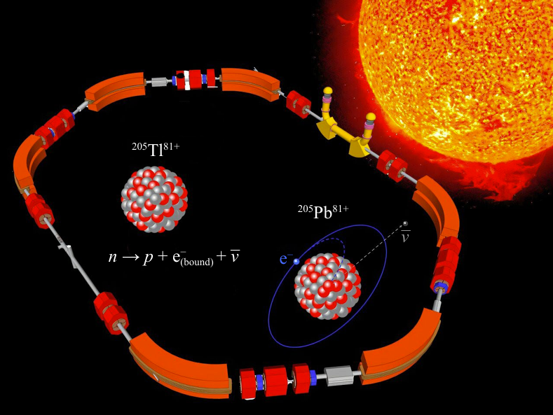 原子核物理的相关研究也对人们了解太阳系有着重要帮助,特别是寿命约为百万年的放射性核素能够揭示太阳的形成历史和其诞生时的活跃核合成过程。20世纪80年代提出的Lorandite实验(LOREX)旨在通过含Tl的天然红铊矿来获得长时间的太阳中微子平均通量(图35)。测量得到的半衰期比理论估计更长,这降低了Lorandite实验中的预期信噪比,从而对其可行性提出挑战。这一测量结果表明,太阳中微子的俘获截面比先前预期的要低。