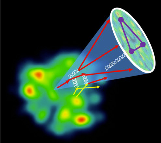 近期,核物理研究人员使用线性玻尔兹曼输运(LBT)和更现实的耦合LBT(CoLBT)模型,完整计算了高能重离子碰撞中γ喷流的能量关联函数。发现重离子碰撞中γ喷注的能量关联函数是由介质响应的弹性散射而非大角度诱导胶子辐射增强的。由于喷流部分子的能量损失和横向动量展宽,在小角度抑制了能量关联函数。进一步表明这些修正对介质内相互作用的角度尺度很敏感。对此类修正的实验验证和测量将揭示重离子碰撞中夸克–胶子等离子体的短距离结构(图16)。