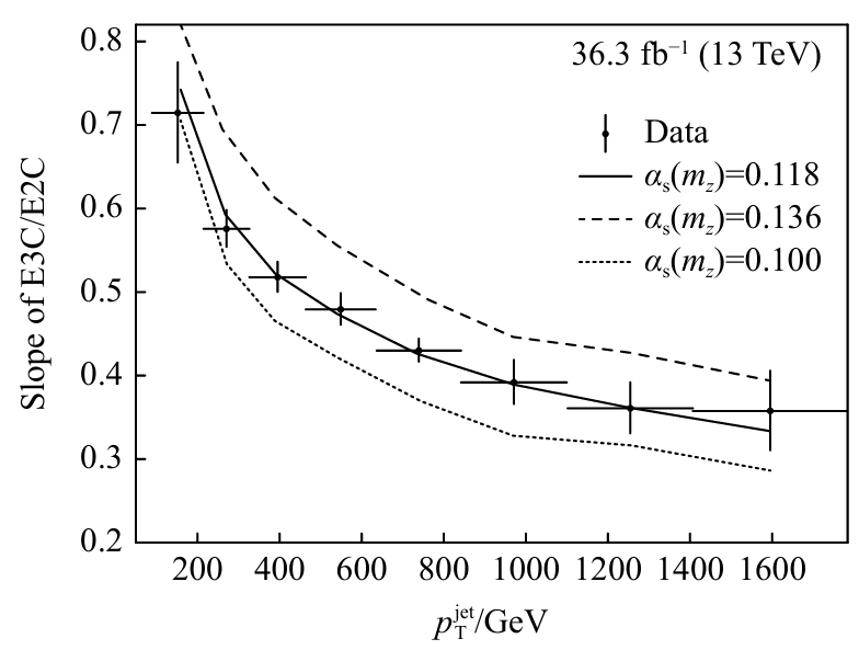 另一方面,对喷注中的能量关联的测量也可以帮助确定强耦合常数。通过紧凑缪子线圈(compact muon solenoid,CMS)探测器实验收集的√s=13 TeV质子–质子碰撞事件样本,可以提取强子喷注中粒子间的能量关联。测得的分布与模拟中的趋势一致(图17),揭示了强相互作用的2个关键特征:约束和渐近自由。通过将测得的三粒子和两粒子能量关联分布之比与理论计算进行比较,确定了Z玻色子质量处的强耦合。