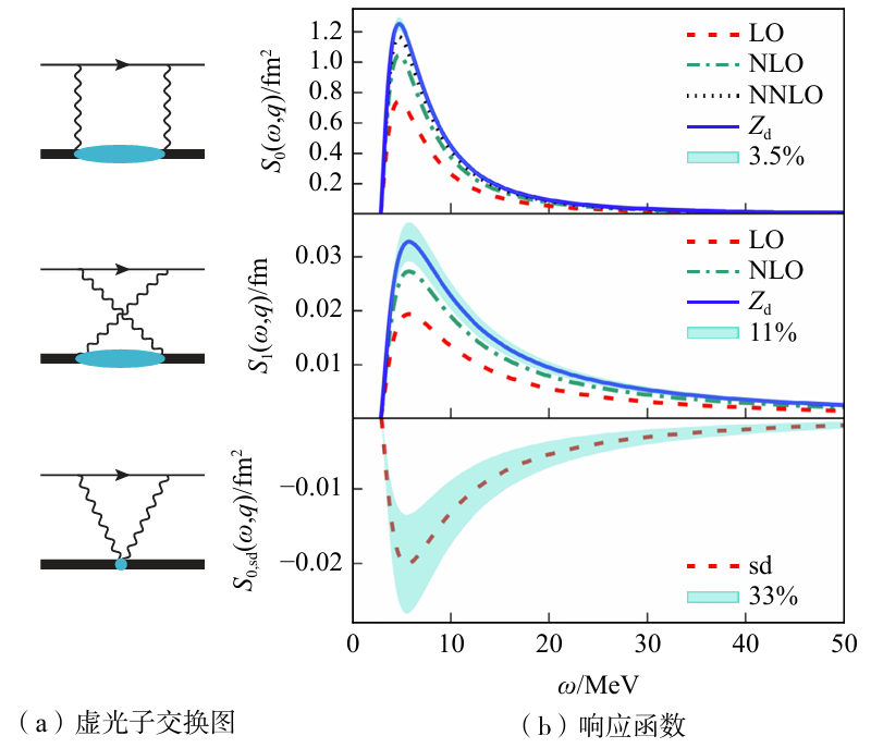 原子核谱学的超精细劈裂现象成为探究核结构和检验量子电动力学(QED)的重要手段。华中师范大学研究团队通过引入光核反应理论,严格计算了双光子交换中的原子核虚激发过程。取得了与实验测量一致的结果(图30)。这一研究解决了氘与缪氘原子超精细劈裂测量与QED预测之间长期存在的不一致性,突显了核结构效应对原子超精细劈裂谱的重要贡献,标志着在利用精密光谱学探测核结构方面取得了重要突破。