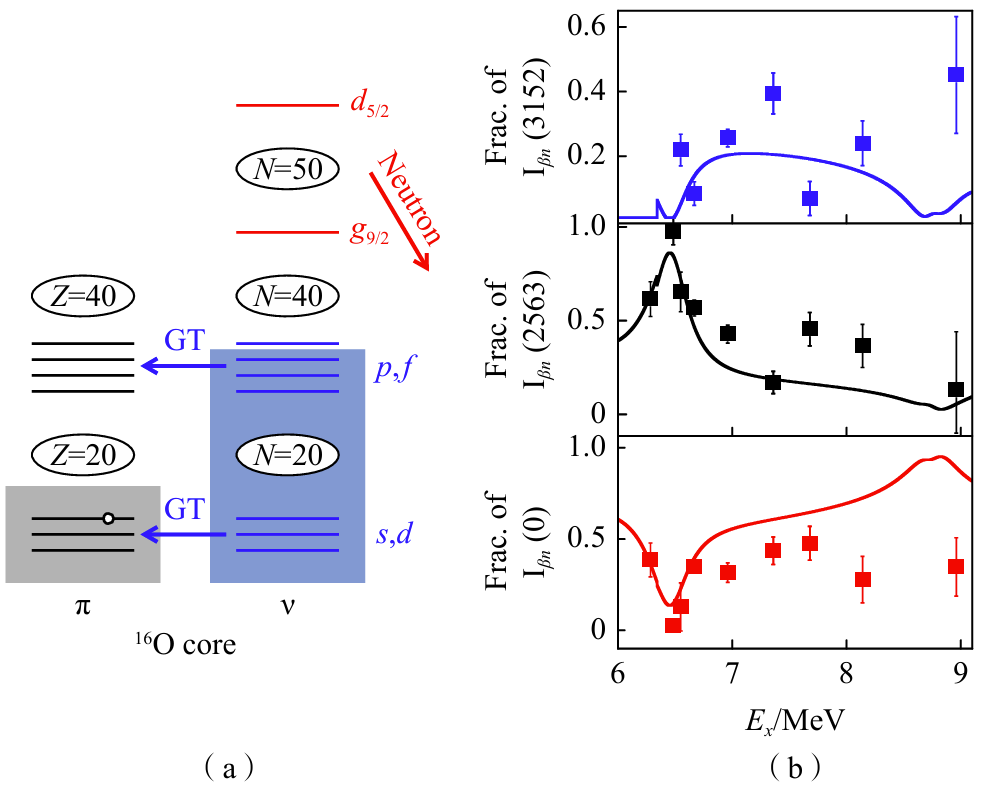 中国学者基于欧洲核子中心(CERN)的同位素质量分离器(ISOLDE)衰变实验终端,研究了51,52,53K的衰变(图8),旨在理解β缓发的中子发射机制。研究指出,观测到的非统计中子发射是通过与具有高中子发射概率的近门态耦合进行的。“复合核”衰变的出现是更高能量处的多重态小贡献的累计导致的。