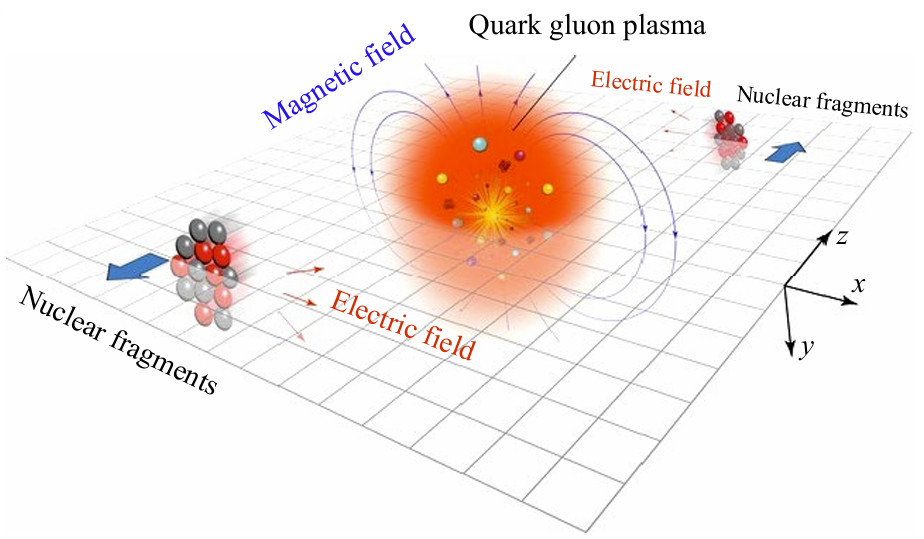 在高能重离子碰撞的非对心碰撞中,由于核碎片带有正电荷且接近光速,理论预测它会在空间中诱导出极强的磁场,如图23所示。磁场的寿命由碰撞能量、夸克–胶子等离子体产生时间及夸克–胶子等离子体电导率等多种因素决定,因此对磁场寿命的研究也能帮助人们了解夸克–胶子等离子体的电磁性质。复旦大学研究组在RHIC–STAR国际合作组的高能重离子碰撞实验中,利用带电粒子在电磁场中的运动学性质,观察到了与电磁场效应预期一致的电荷依赖的粒子直接流劈裂。此项研究不仅为量子色动力学研究领域带来新的科学工具,也为未来的实验物理提供了新的研究方向。