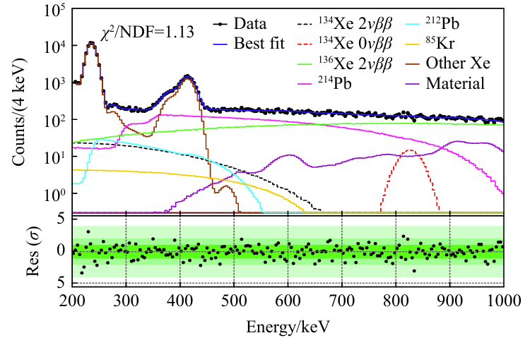 作为超出标准模型的新物理,0νββ的发现将为中微子具有马约拉纳性质以及轻子数守恒不成立提供明确的实验证据。由上海交通大学主导的PandaX合作组利用PandaX–4T探测器,在中国锦屏地下实验室开展了对自然氙中134Xe和136Xe的0νββ研究。图27中给出了134Xe的2νββ和0νββ搜寻能谱拟合。