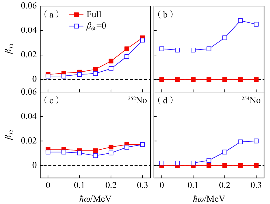 实验上,人们已经利用束流、同核异能素和衰变光谱测到了253Fm、251Md、252,254No、255Lr和254,256Rf等超重核的转动带。而理论上,通过在三维空间的协变密度泛函理论和壳模型方法,研究了全变形空间中超重核的旋转特性,以微观和自洽的方式处理了配对关联、变形和转动惯量。无需任何可调参数,即可很好地再现超镄核252,254No和254,256Rf中观测到的旋转带的运动学和动态转动惯量。该研究首次发现,八极变形的出现应该是252No和254No中观察到的显著不同转动行为的原因(图5)。该研究结果为长期存在的No同位素转动行为之谜提供了微观解决方案。