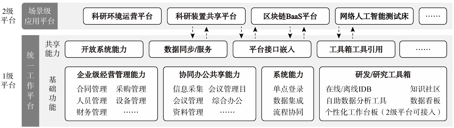 2)中间层面向服务,构建2级平台。2级平台架构将能力按照场景封装并提供统一入口,1级平台负责承载面向全体员工开放的能力,以及整体经营管理的能力,2级平台负责承载专业研发的能力。2级平台之间通过数据和能力共享实现互通,推动科研工作并沉淀科研数据,如图3所示。