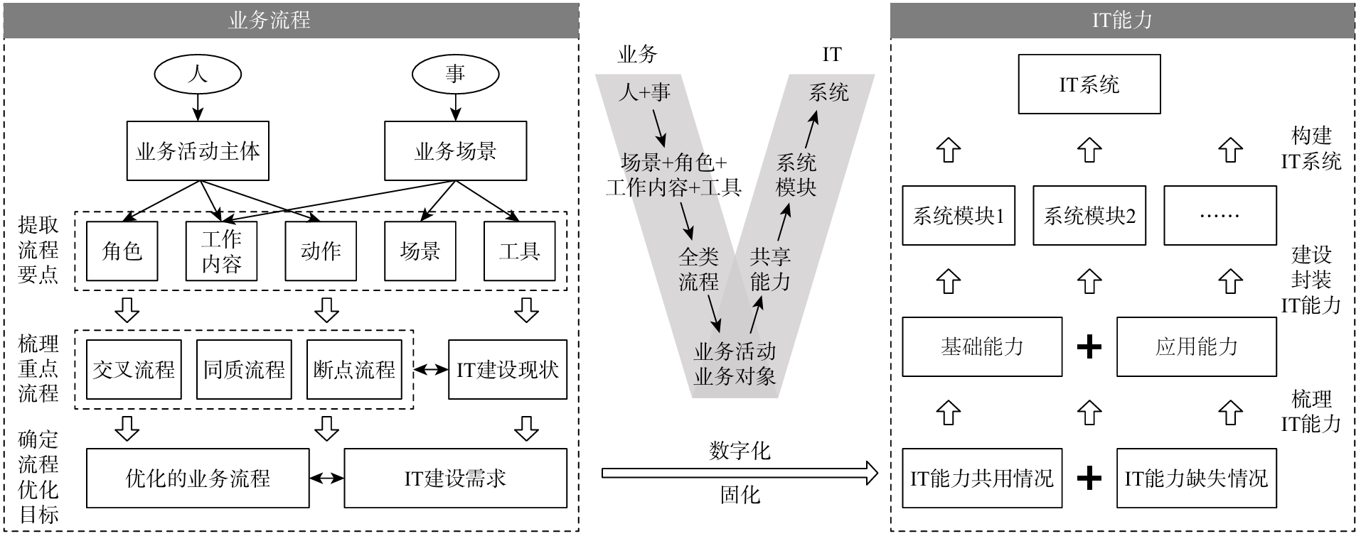 1)梳理IT能力。重点围绕2类业务流程开展IT能力梳理。具体地,针对目前共用同一平台或工具的业务流程,梳理该平台或工具的IT能力,对关键能力、共享能力进行沉淀和封装,并反向优化业务流程。针对目前缺失IT支撑的业务流程,明确所需IT能力并梳理现有IT能力,进一步判断建设的必要性和可行性。