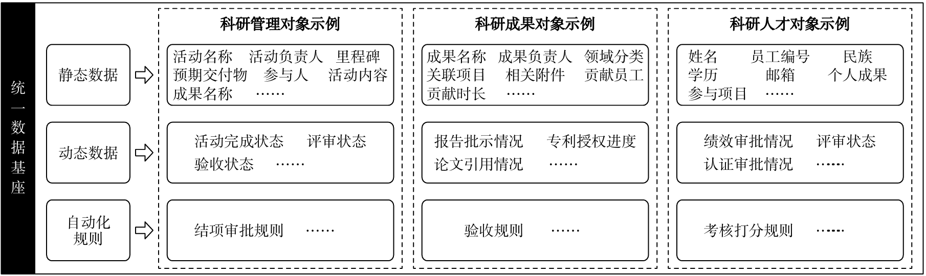 1)构建科研机构的数据基座。通过整合静态数据、动态数据和自动化规则,对科研机构内所有科研对象进行三维数字映射。静态数据记录科研对象的基础属性,动态数据捕捉其变化过程,自动化规则包含科研业务中的系统判断逻辑。这一多维映射策略旨在形成统一的数据基座,为后续数据分析和决策提供基础,如图1所示。