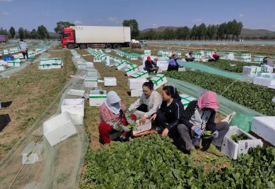 工作人员在菠菜地进行收割指导