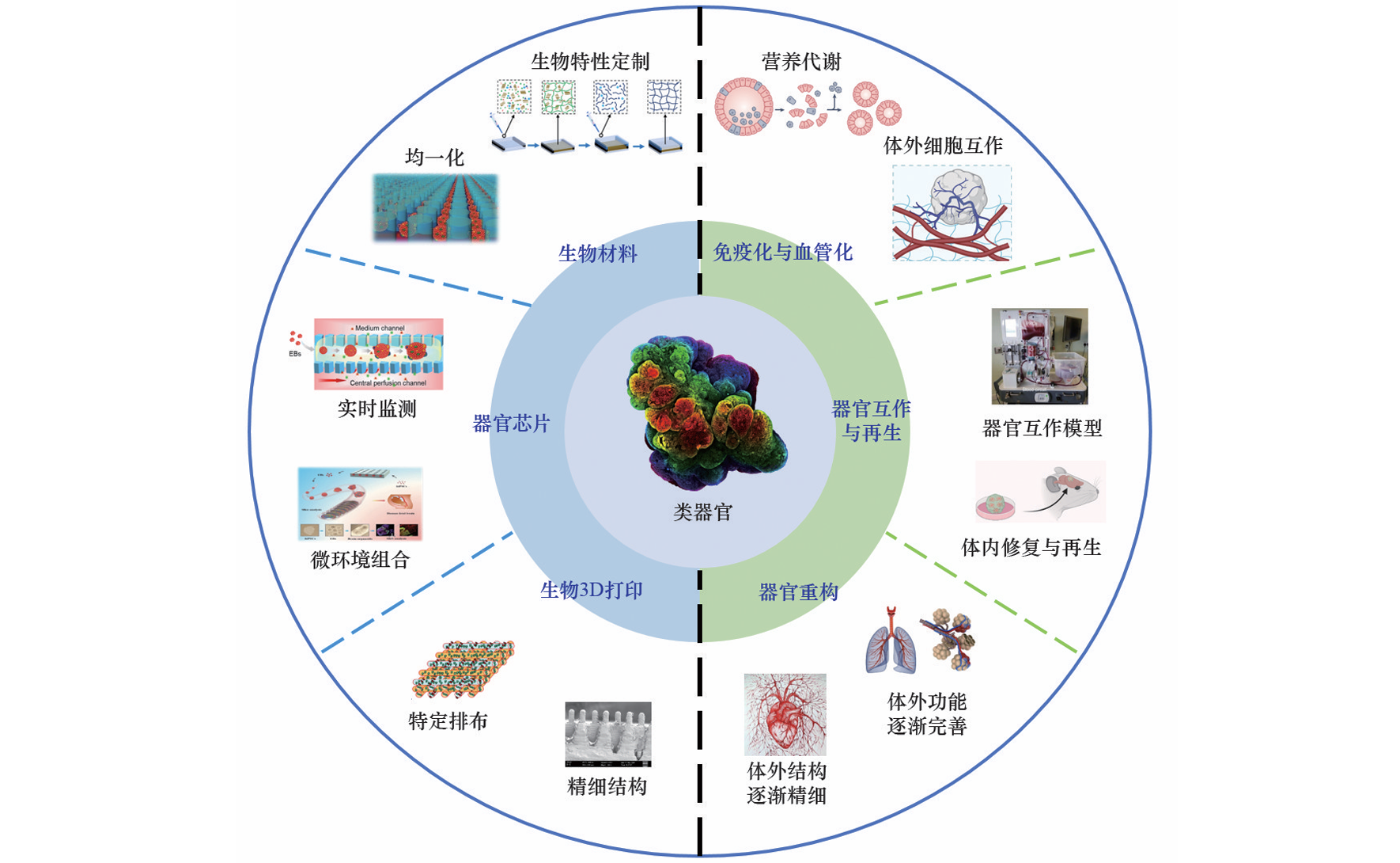 正常器官组织的发育调控及稳态维持,以及肿瘤组织的发生发展规律,一直以来都是研究人员关注的焦点,类器官技术极大地推动了这些议题的研究。类器官含有相应组织器官的细胞类型,由干细胞和各种具有不同功能的分化细胞构成,通过了解这些细胞类型、分化机制和互作关系,以及对发育过程中的细胞命运决定、微环境互作等方面的深入研究,各种组织的发育过程及调控机制得以通过类器官呈现。随着对细胞分化机制的理解和技术手段的发展,更加契合体内真实情况的类器官得以构建,类器官中的细胞世界也更加微观化。通过更改培养条件、基因编辑等方法可以深入探究干细胞的更新与分化调控。与此同时,通过结合细胞生物学与分子生物学等手段,类器官系统能提供一个高效的平台揭示不同细胞间的相互作用及其调控机制。此外,类器官培养技术发展至今已不局限于简单的多细胞自组装过程,而是引入血管化、集成器官芯片等新概念,结合生物医学工程的微流控、新型生物材料等技术,使得类器官模型能够更细致全面地反映体内的生物学特性。