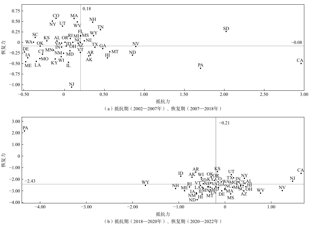 基于抵抗期与恢复期划分,运用式(2)和式(3)计算了2002年1月至2022年12月中美基础研究创新韧性。表明中国基础研究创新韧性整体发展平稳,稳定性较高,且平均水平高于美国。绘制两国基础研究创新韧性在2个周期内散点图,分析其时间演变特征。图3中,水平和垂直的实线分别代表抵抗力和恢复力平均水平,将图划分为4个区域。