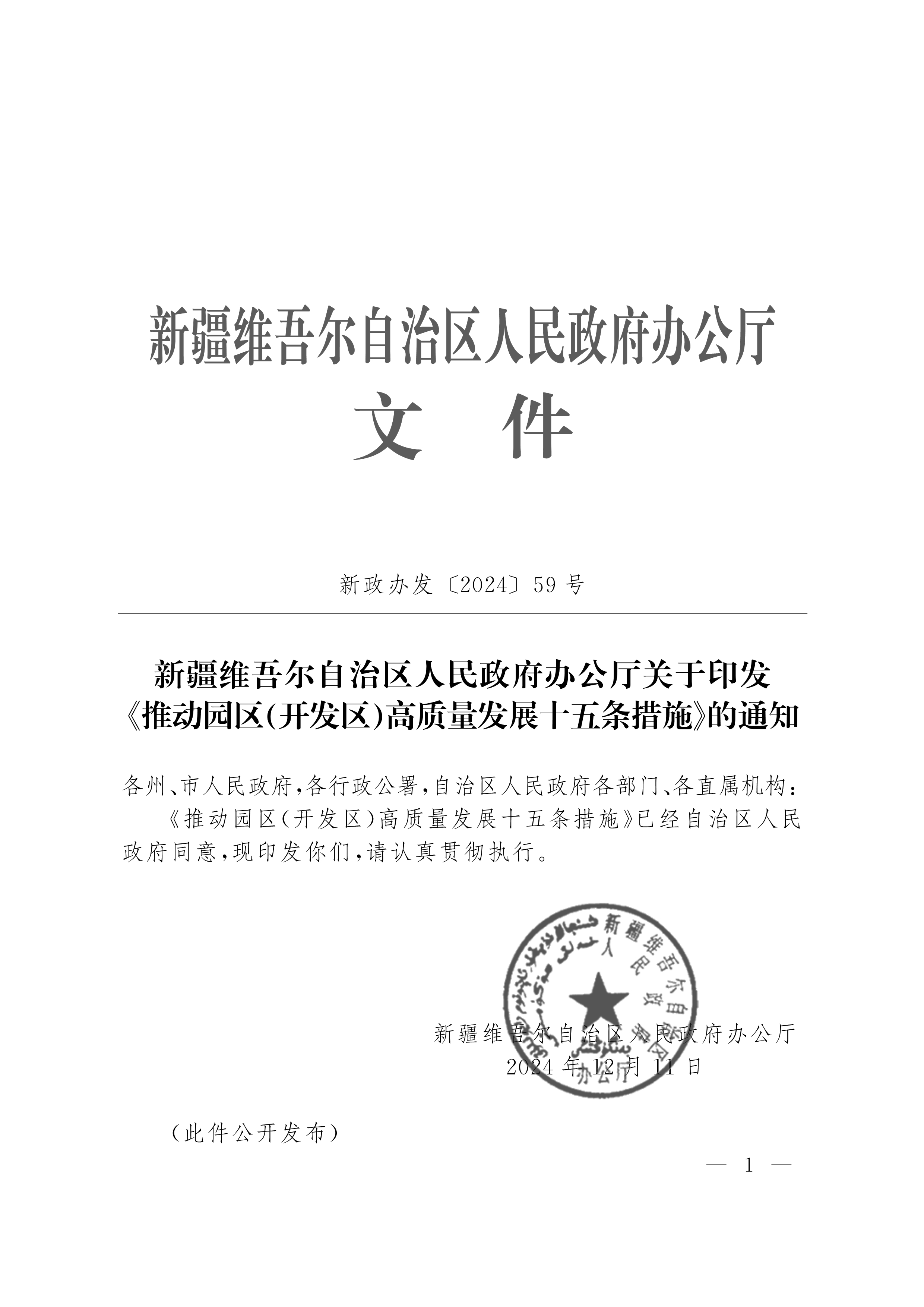新疆维吾尔自治区人民政府办公厅关于印发《推动园区(开发区)高质量发展十五条措施》的通知