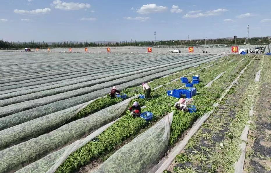 6月11日,记者来到原州区彭堡镇姚磨万亩冷凉蔬菜基地,覆盖着防虫网的蔬菜地在阳光下翻起层层银色涟漪,连片的绿色蔬菜郁郁葱葱、长势喜人、青翠鲜嫩,工人正忙着采收已经成熟的生菜、油麦菜、菠菜等蔬菜。