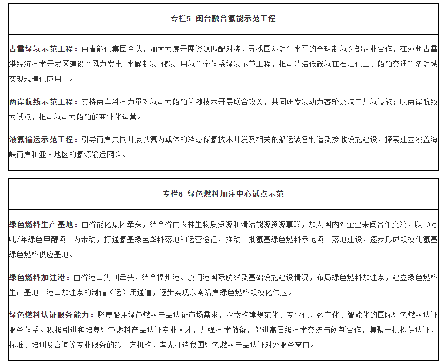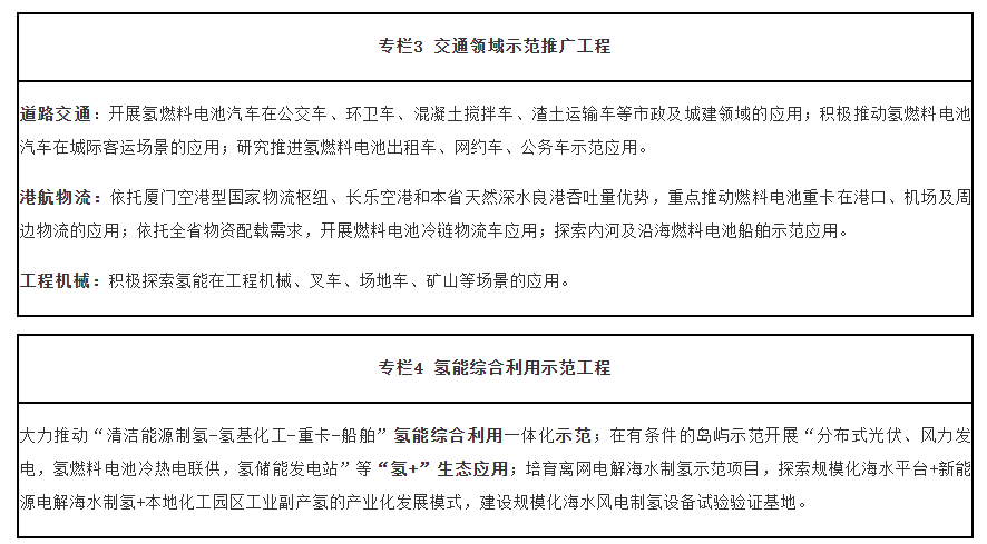 加快推进福州、厦门国家燃料电池汽车示范城市建设,参照国家燃料电池汽车示范城市政策,研究制定地方配套支持政策;推广50个氢能产业应用示范场景;支持省能化集团有效整合资源要素,开展清洁能源制绿氢制绿色氢基燃料示范,实施“绿电制氢+余电上网”,通过稳定的绿氢供应带动下游产业应用;打造绿氢产业园区,实施清洁低碳氢替代应用;推进嘉庚创新实验室全国首个海岛绿氢综合能源应用示范项目;支持钢铁企业牵头开展氢能冶金技术研发,推进钢铁行业绿色转型;鼓励开展可再生能源制氢示范,探索布局氢基绿色船舶燃料合成与加注试点项目,推动船舶行业节能降碳转型。