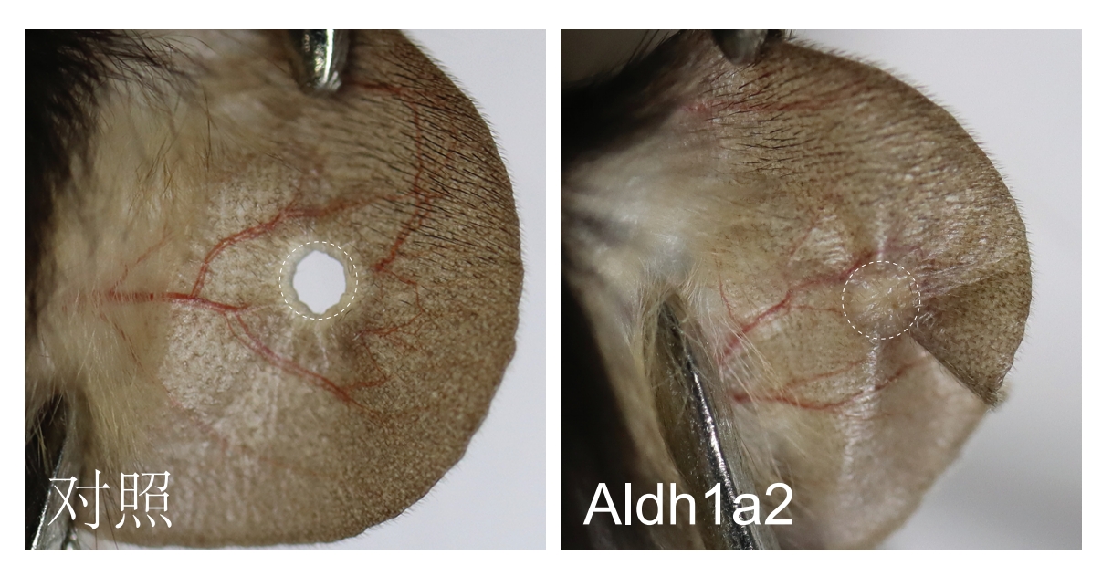 王伟团队对家兔和小鼠耳廓损伤修复过程进行系统性比较研究,利用空间转录组测序、细胞谱系追踪等技术,精准解析了修复过程中细胞类型及基因表达的差异。研究发现,视黄酸是决定哺乳动物再生能力的关键“分子开关”,视黄酸生成不足会导致再生失败,而外源性补充视黄酸可激活再生。“视黄酸能调控基因表达、细胞分化及微环境信号,成为连接遗传调控与再生能力的核心枢纽。”王伟解释道。