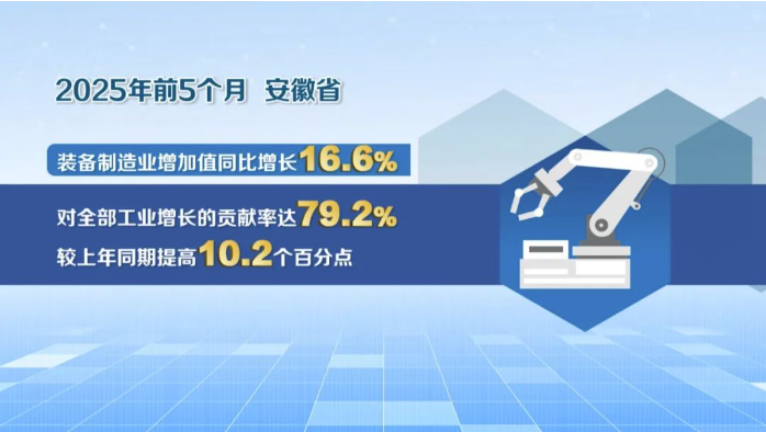 今年前5个月,安徽装备制造业增加值同比增长16.6%,对全部工业增长的贡献率达79.2%、较上年同期提高10.2个百分点。