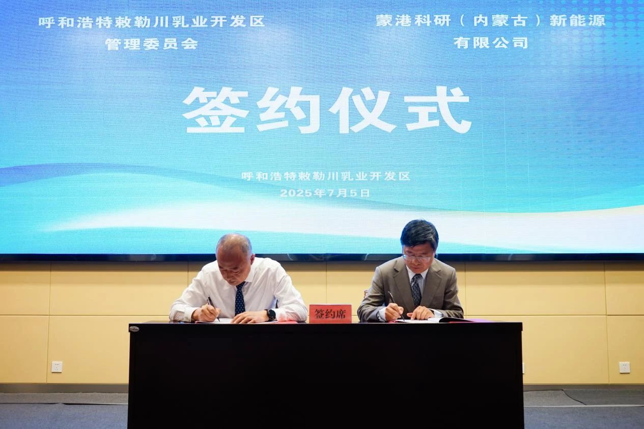 敕勒川乳业开发区管委会主任徐相军与加拿大工程院院士、香港大学教授、蒙港科研(内蒙古)新能源有限公司法人徐春保签订项目合约。