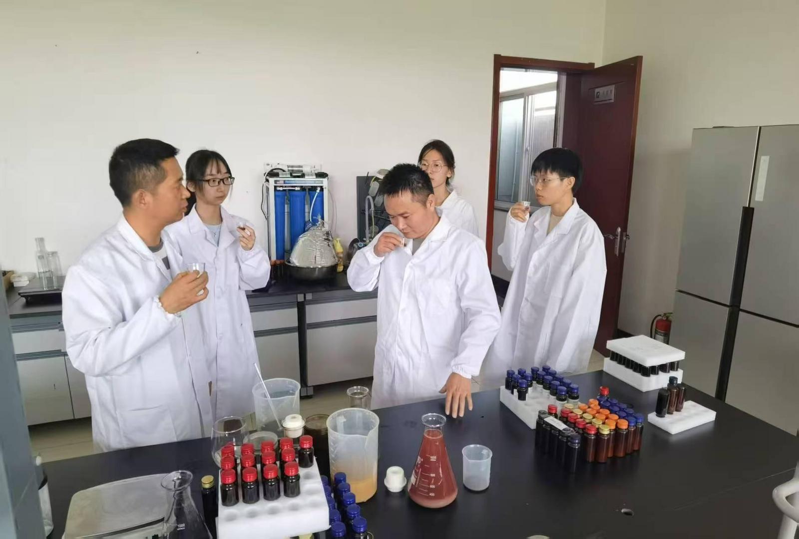 张智锋(左一)与科研团队一起研发枸杞原浆类产品。