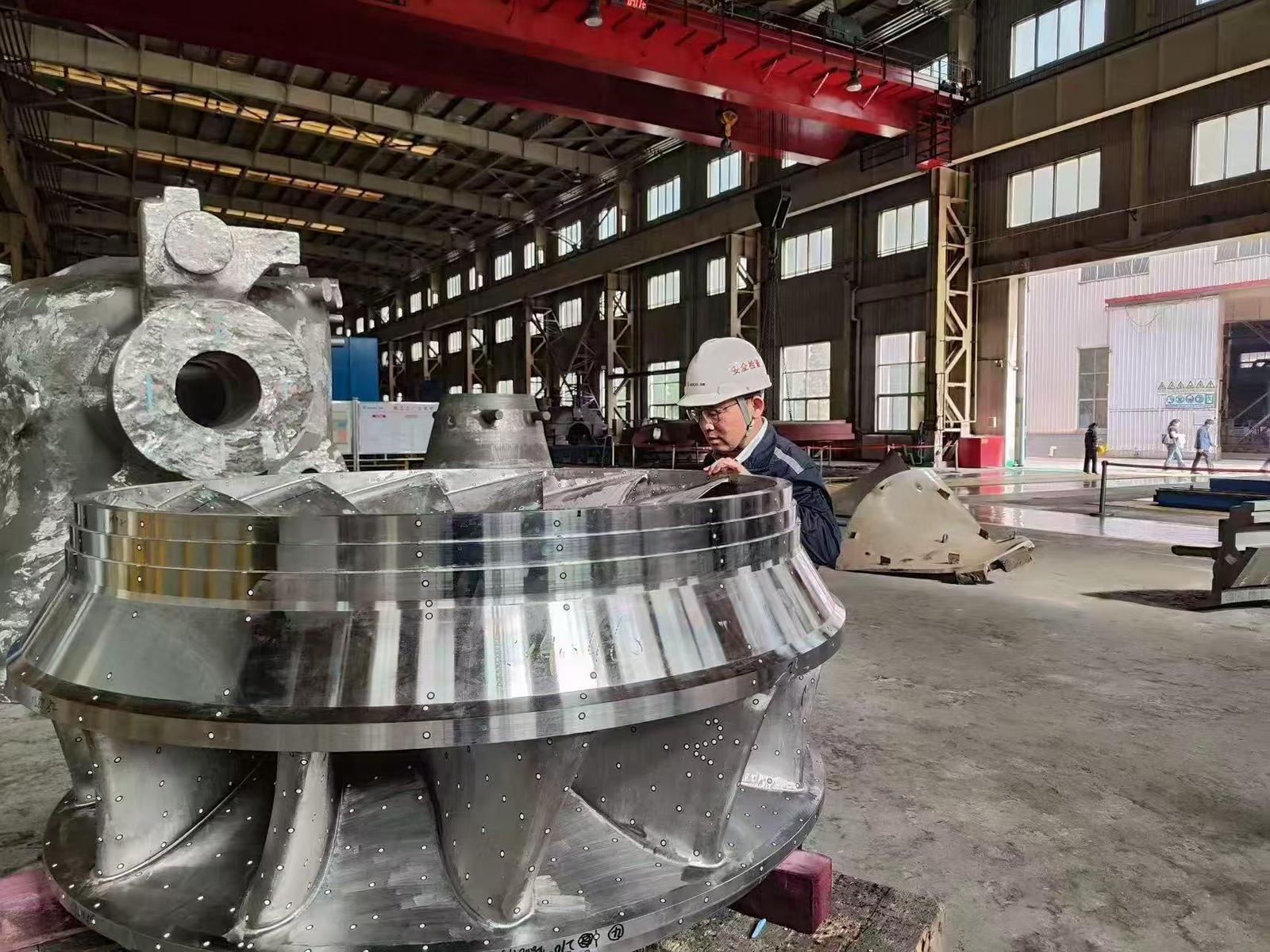 撖俊虎现场查看水轮机整铸转轮检测情况。