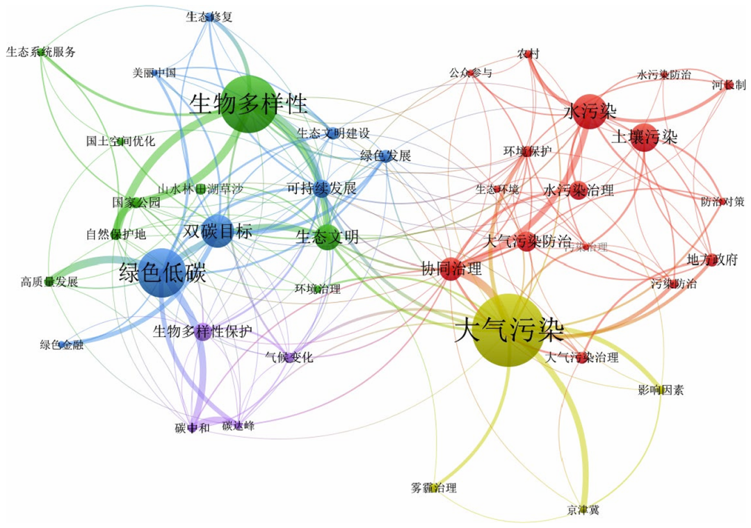 对中国知网数据库近5年含有美丽中国关键词的科研论文采用VOSviewer科学知识图谱软件进行网络分析(图1),结果可以看出,其中涉及生态环境领域呈现出4项主要类别:首先,针对大气领域的研究最为集中,其中重点关注与雾霾和京津冀相关的内容;第二类为生物多样性领域,包含了自然保护地、国家公园、国土空间、生态文明、生态系统服务等关键词;第三类聚焦绿色低碳和“双碳”目标领域,包含可持续发展、绿色金融、生态文明建设等关键词;第四类是水污染和土壤污染治理领域,二者协同或者与大气污染三者协同治理是该领域关注的重点。