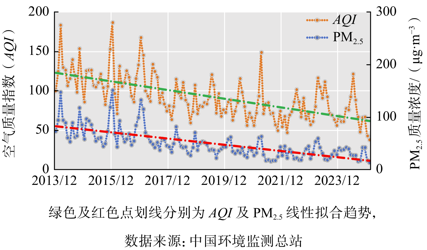 图2 北京市空气质量指数及PM2.5月均值