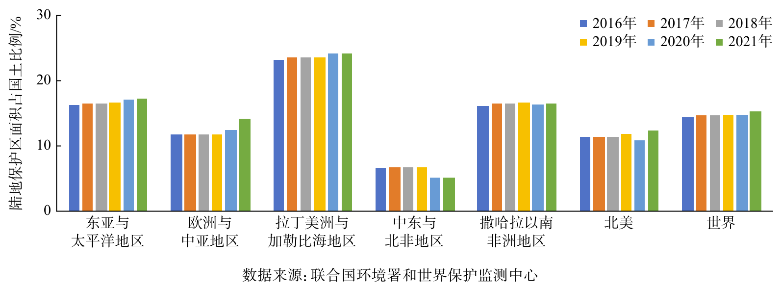 图3 全球主要地区保护地占国土陆地面积比例